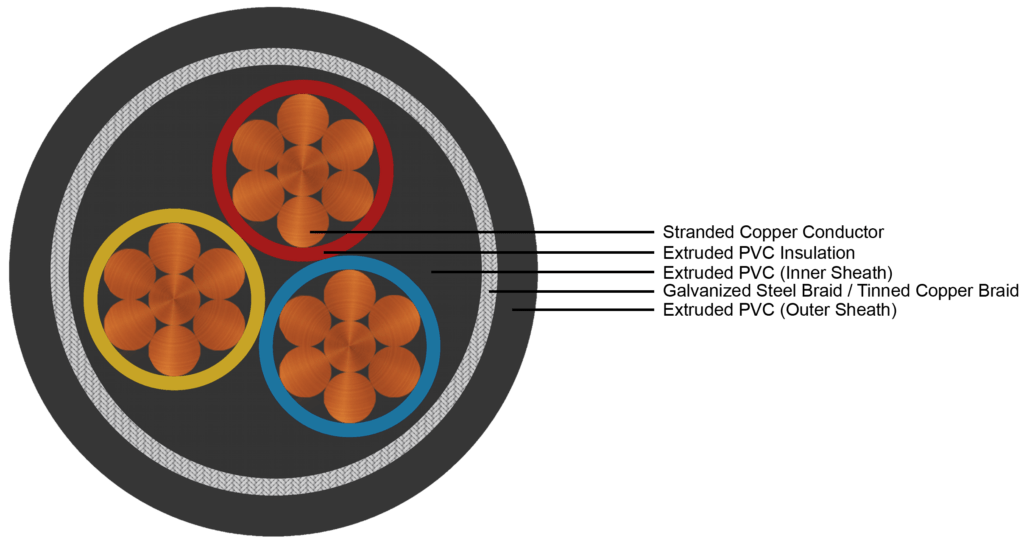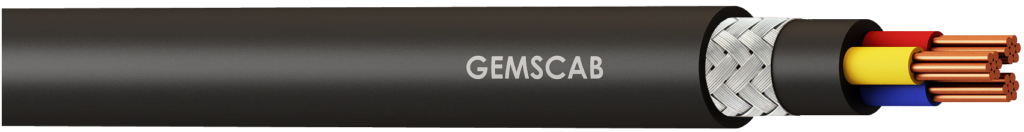“GEMSCAB” make 1100 V Braided cable, generally conforming to IS:7098 (PT:I), Copper conductor, XLPE insulated, cores laid up, overall shielded, Annealed Tinned Copper Braided/ Galvanized Steel Braided, PVC inner sheathed, Galvanized Steel Round Wire/ Flat Strip armoured, overall PVC sheathed.