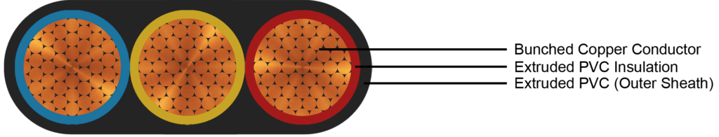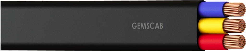 “GEMSCAB” make 1100 V, 3 Core Flat Submersible Cable insulated and sheathed with PVC generally to IS:694-2010, annealed bare flexible copper conductor, PVC insulated, overall PVC sheathed cable.